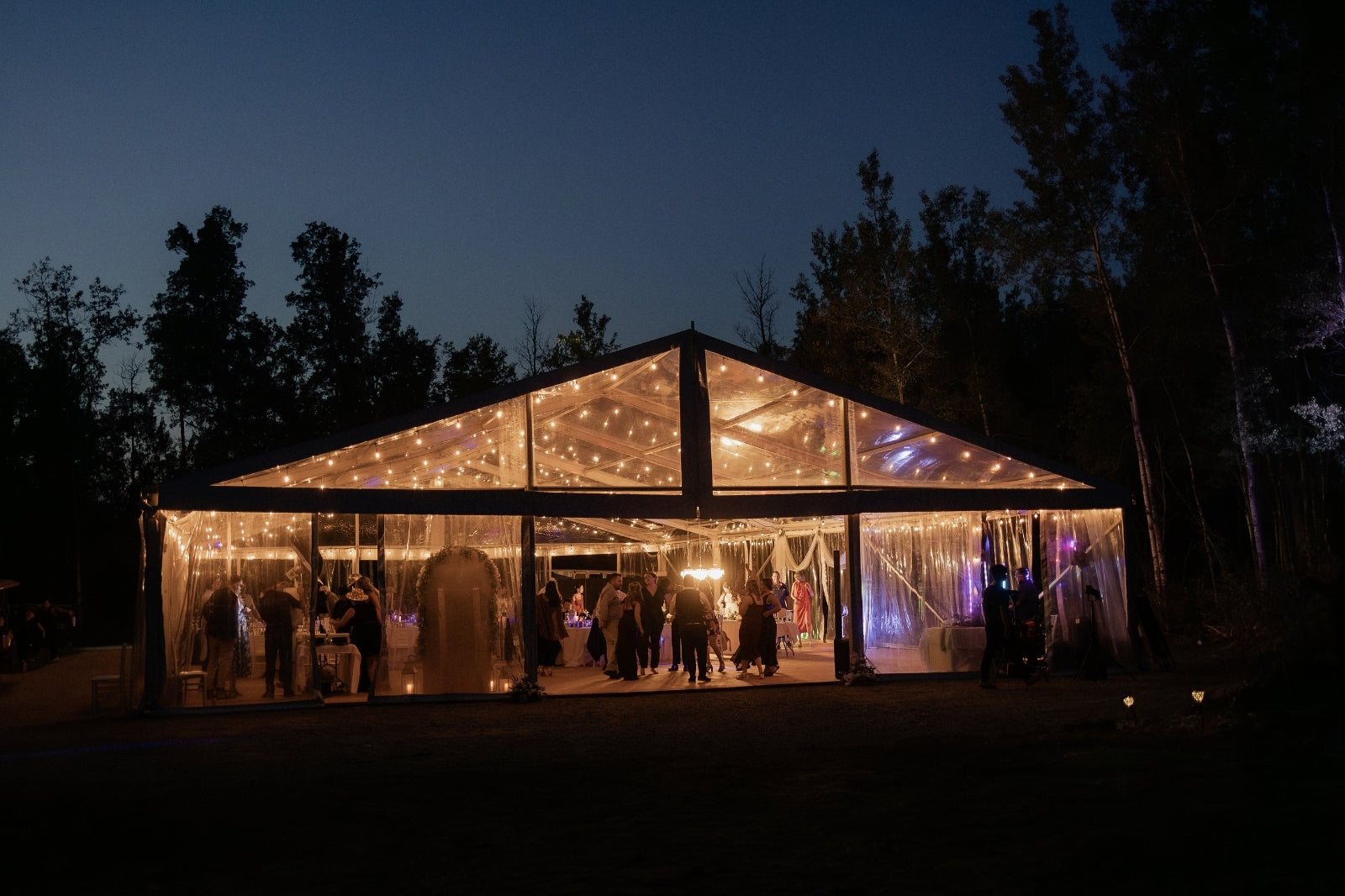 This beautifully designed tent at 4100 square feet, is spacious enough to accommodate up to 250 guests and is nestled in a serene, picturesque location of the arboreal forest—ideal for creating magical moments that will last a lifetime.